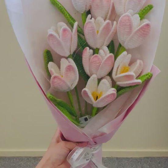 Brighten any occasion with this handmade crochet tulip bouquet. Featuring 10 soft pink blooming tulips crafted from premium cotton yarn, the bouquet stands 48-50 cm tall and 25–28 cm wide, wrapped in pastel pink paper for a gentle, romantic look.